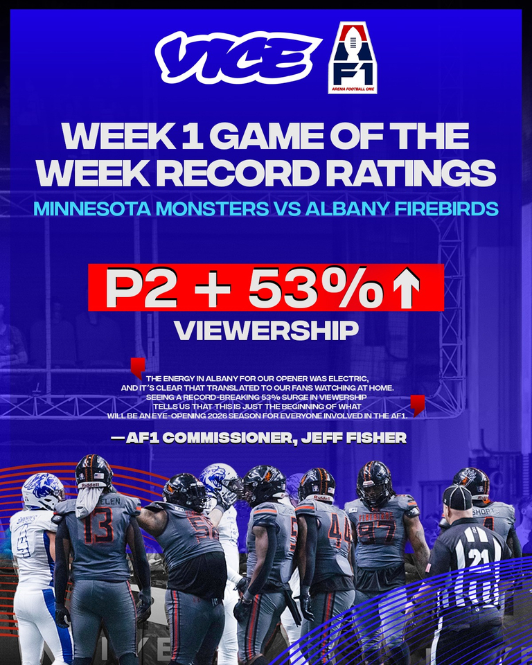Nashville, TN – The AF1 is proud to announce that the inaugural Vice Game of the Week on April 11th 2026, has set a new standard for arena football viewership. The season’s opening broadcast, featuring a high-octane showdown between the Albany Firebirds and the Minnesota Monsters, saw a massive 53% year-over-year increase compared to the 2025 season’s average viewership.